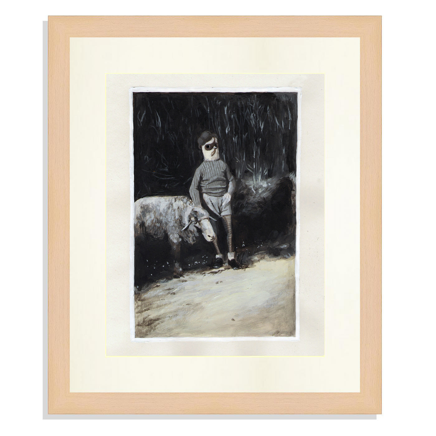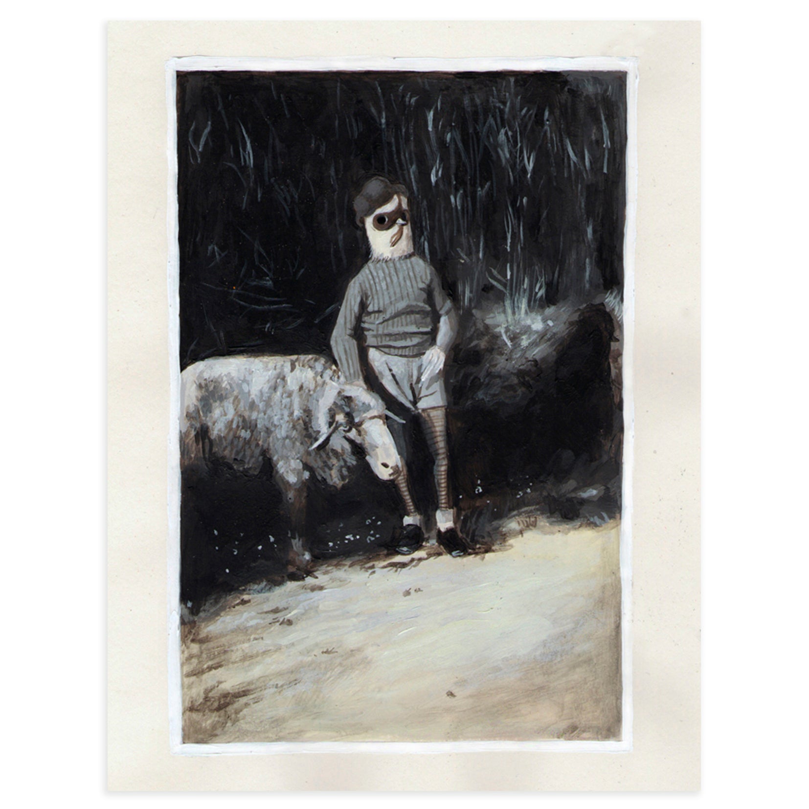 Cuándo puede haber de simbólico en una obra que llegar a provocar la lágrima en el que observa! Esta pieza de David de las Heras, realizada en Barcelona en 2014 para el proyecto editorial ¿Cómo se visten los pájaros? de Silvana d’Angelo (Ed. A Buen Paso), muestra el imaginario de fábula de los primeros años de creación del artista. Un niño-pájaro permanece inmóvil, nostálgico, junto a una oveja. Espera a su abuelo, y lo que ocurre tras ese deceso, es la nostalgia.