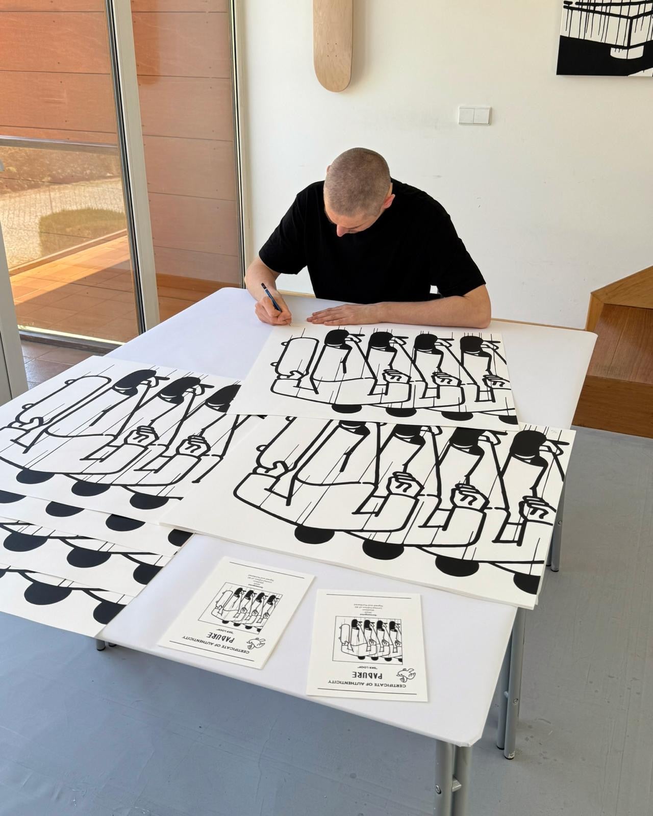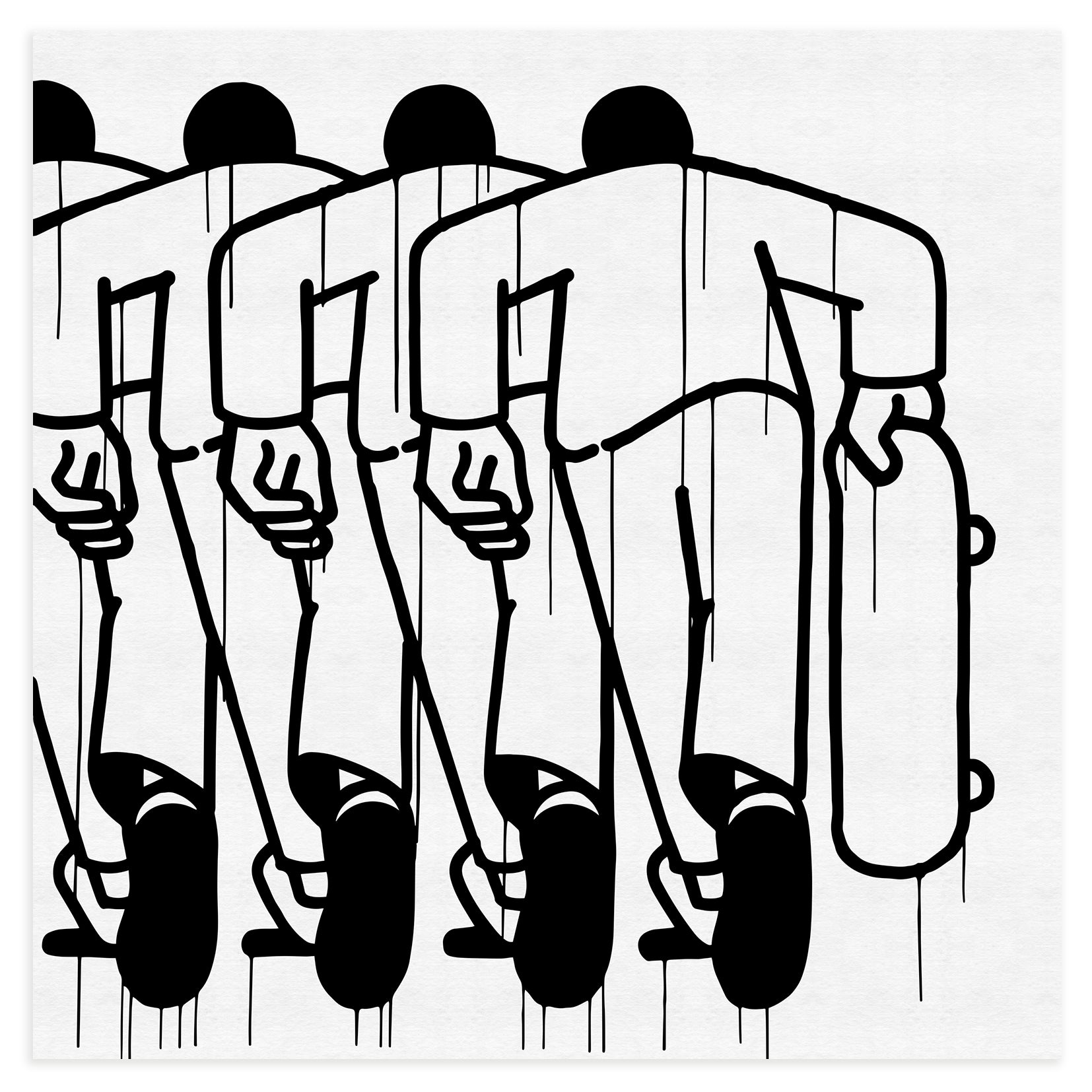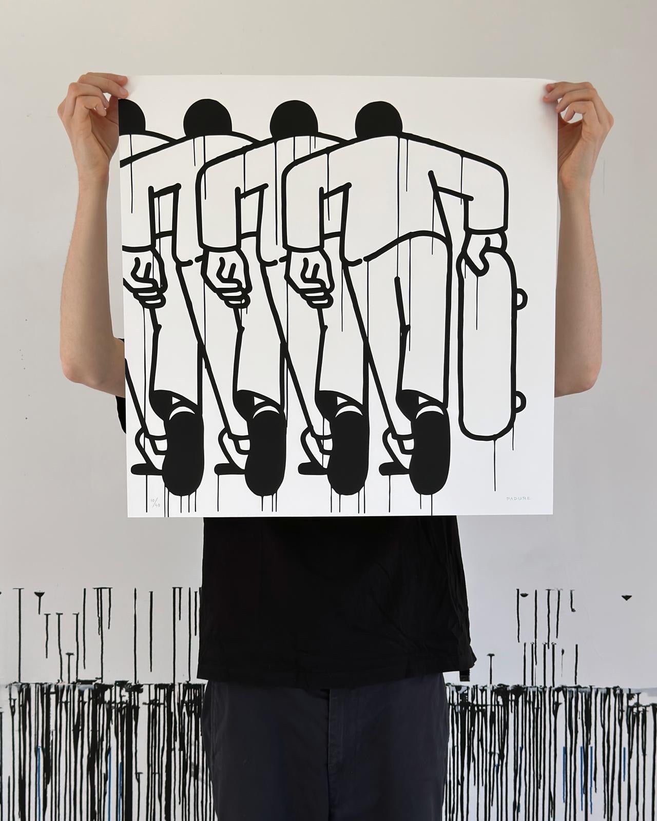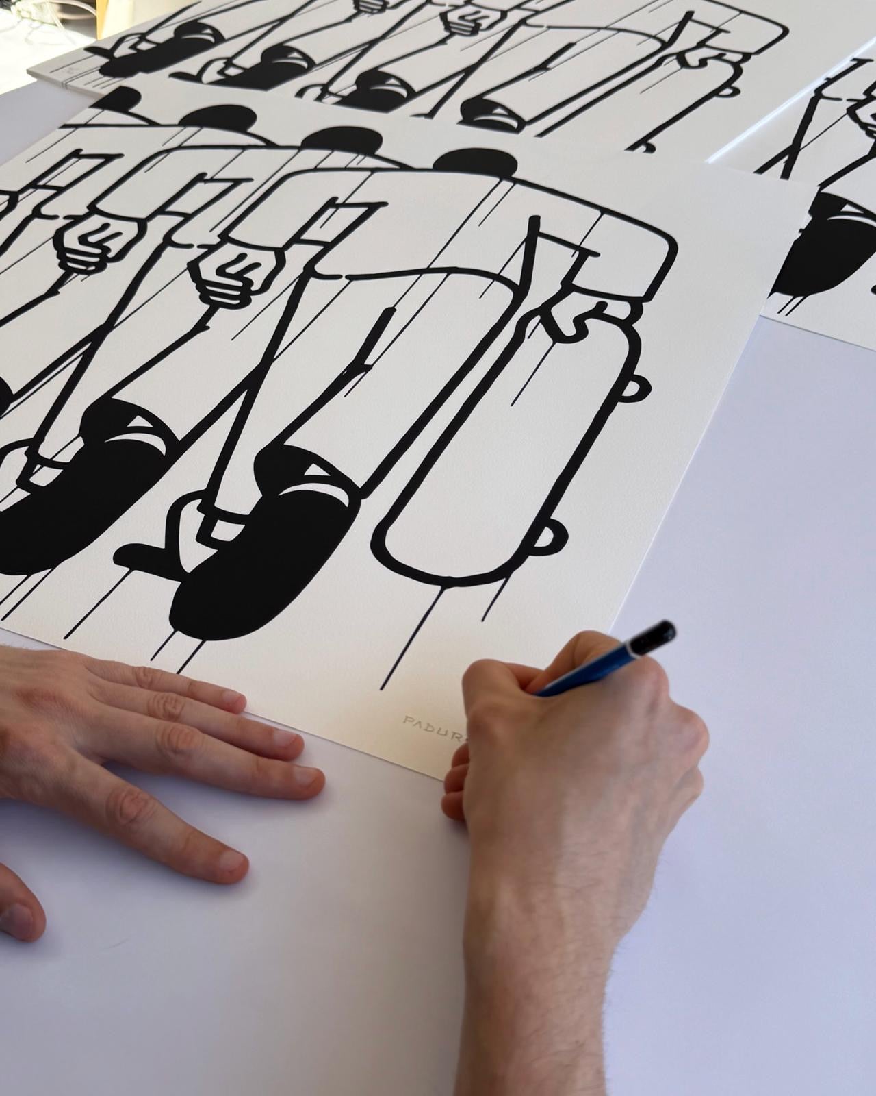 La cultura urbana forma parte del ADN de la obra de Daniel Padure, y en esta pieza toda su iconografía se rebela tras la línea concisa y minimal de su trazo. La repetición es parte de la simbología del skate, cada loop, es un aplauso de la crew que te acompaña.